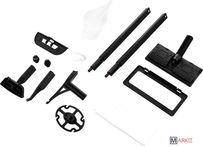 Дополнительные насадки и приспособления - тряпка для отпаривания;- латунная щетка;- тряпка для пола;- насадка для отпаривания;- рамка для ковра;- мерный стакан;- круглая нейлоновая щетка;- держатель шнура;- держатель для одежды;- запасные уплотнительные кольца;- колпачок на паровое сопло.