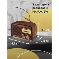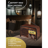 Радиоприемник MIRU SR-1027 коричневого цвета имеет ретро дизайн, простой функционал и обеспечивает приём сигналов в диапазоне FM, AM и SW. Аналоговый способ настройки частоты предполагает более точное и быстрое улавливание нужного канала. Для улучшения качества сигнала у радиоприемника имеется поворотная телескопическая антенна. Радиоприемник SR-1027 может работать как от сети 220В и аккумулятора, так и от двух батареек типа R20(D). Органы регулировки громкость и смена диапазонов расположены на передней панели приемника. Также предусмотрено проигрывание с USB и microSD накопителей. Данный радиоприемник отлично подойдет для туристов, дачников и просто любителей отдыха на природе.